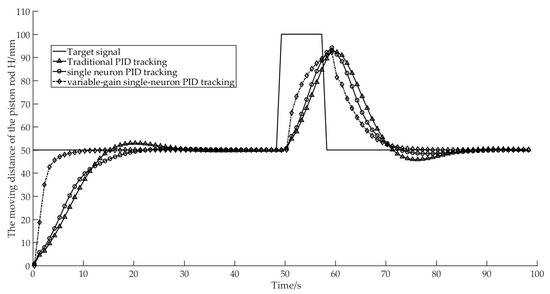 In order to verify the performance of the variable-gain single-neuron PID, this study introduced a conventional incremental PID and a common single-neuron PID for simulation comparison. The Simulink simulation model of the lifting system is shown in Figure 9. Using the trial and error method to adjust the kp, ki and kd parameters of the conventional incremental PID, the parameters were determined as kp = 0.05, ki = 2.18, and kd = 0.01. The initial values of the weighting coefficients of the single-neuron adaptive PID were set to arbitrary equal and non-zero values, and the proportional gain K and the learning rates ηP, ηI, and ηD were obtained by experiments. First, we adjusted the proportional gain K to make the controller response faster and the overshoot smaller, and then adjusted ηP, ηI, and ηD to further reduce the adjustment time and overshoot. Through the experiment, the following parameters for the single-neuron adaptive PID controller were determined: proportional gain K = 0.12, and learning rates ηP = 0.4, ηI = 0.12, ηD = 0.4. The upper and lower limits of K of the variable-gain single-neuron PID were determined as KA = 0.09 and KB = 2.15 by the trial and error method. After fixing KA and KB, the error ranges of A = 0.01, B = 1 were determined. In order to verify the feasibility of the algorithm, an input angle deviation signal of y = 50 was set and a disturbance signal of y = 100 was added for 40~50 s, referring to the three-point hitch mechanism of the tractor. The simulation results are shown in Figure 10.