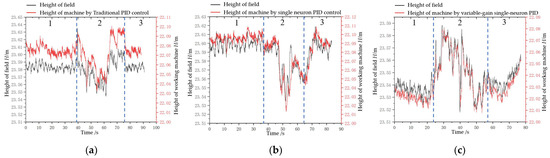 Effects of rotary burying heights following surface changes under three algorithms. (a) Results of conventional PID control; (b) Results of single neuron PID; (c) Results of variable-gain single-neuron PID. Note: area 1 is a flat area at the head of the field, area 2 is an area with surface unevenness in the field, and area 3 is a flat area at the end of the field.