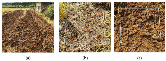 Measuring of operation quality. (a) measuring of tillage depth; (b) measuring the amount of stubbles before tillage; (c) measuring the amount of stubbles after tillage.
