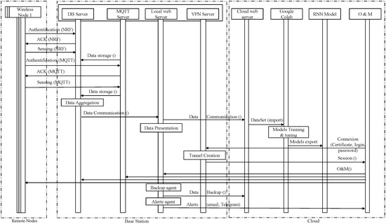 - System security approach and design have been implemented in our platform. Access to the BS is ensured locally with user credentials or remotely through a secured VPN tunnel. We deploy OpenVPN within the BS. Meanwhile, because OpenVPN needs to follow an assigned IP address, while our system is connected to a public address, we can overcome this challenge by deploying a NoIP client within our BS that plays the role of a dynamic DNS pointing continuously to a static hostname such as “www.ensem-aws.tk” accessed on 13 April 2021. Different user roles are configured with different roles and privileges. Additionally, offline data snapshots of the OAM & Data dashboards are stored in the cloud and consulted separately.