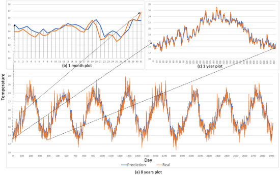- RMSE, MASE: The calculation of the Root Mean Square Deviation (RMSE) represents the square root of the average of squared errors. It is mainly computed to measure the deviation between the actual values and the prediction values to define the accuracy of different models. The MASE was proposed in [49] as an assessment technique to define the accuracy of forecasts in regression models. As a mean absolute approach, MASE uses the ratio of errors which is allowing it to be independent of the scale of the forecaster. The RMSE and the MASE can be calculated following the equations:where is the predicted value associated with the actual value X, and n is the size of the dataset. The larger the MASE and the RMSE mean, the enormous difference between the predicted and actual values, while the smaller the MASE and the RMSE mean, the closer the prediction values to the actual values.
