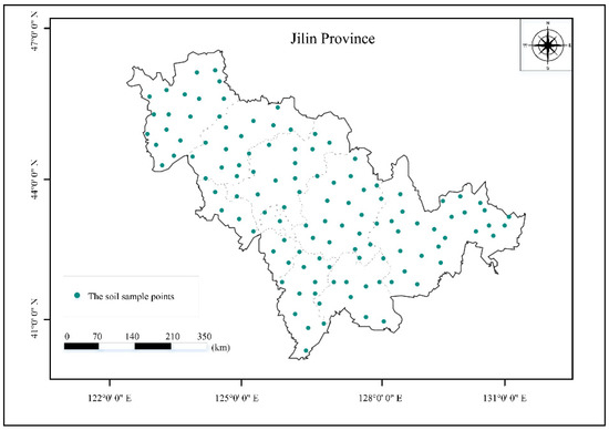 The study area is located in northeastern China, as shown in Figure 1 (44°50′ N, 121°38′ E, 46°19′ N, 131°19′ E), with a sampling area of 187,400 km2, in a temperate continental monsoon climate with an average annual temperature of 5.1 °C, average annual rainfall of 400–600 mm, and one of the world’s three prime maize belts, which is an important grain-producing area. It is one of the most important grain-producing regions in China. The main soil types in the region include dark brown loam, black calcium soil, white pulp soil, herbaceous soil, and black soil, and is one of the major production areas of maize and rice in China. Due to the crop rotation pattern and improper fertilization, the total nitrogen content of the soil has decreased, thus this study aims to help optimize fertilization to improve the soil nutrient content structure and protect the black soil.