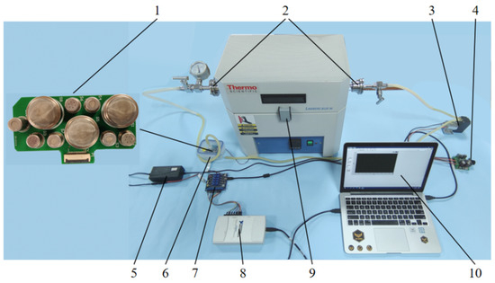 The artificial olfactory system is divided into three main parts [17]. In the first part, sample preparation; in the second part, detection system; and in the third part, data processing system. Figure 2 shows the hardware components of the detection system which mainly includes the muffle furnace, gas sensor array, reaction chamber, valve, gas pump (for cleaning the reaction chamber), signal processing module, data acquisition card, and computer. The muffle furnace, manufactured by Thermo Scientific Lindberg, USA, is used here for cracking large molecular compounds in soil. The gas sensor array is located in the reaction chamber and communicates with the signal processing module through the flexible flat cable (FFC). The data acquisition card connects to the signal processing module through a DuPont cable and transfers the acquired data to the computer via USB for display and storage. Power is supplied to the signal processing module by a 12 V power adapter. Among them, the gas sensor array is the basis of the detection system, as shown in Table 1, this study uses MOS sensors produced by Figaro Japan specifically for high-precision detection of low concentration gases. This sensor array has a high specificity and some cross-sensitivity, which improves the accuracy compared to a single type of sensor array. The signal processing module is used to power the sensor array and the measurement circuit output. A USB-6210 acquisition card from National Instruments (NI) was used to acquire the gas sensor array response data.
