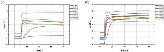 Sensor response curves: (a) 0.2 g·kg−1 soil sample; (b) 4.1 g·kg−1 soil sample.