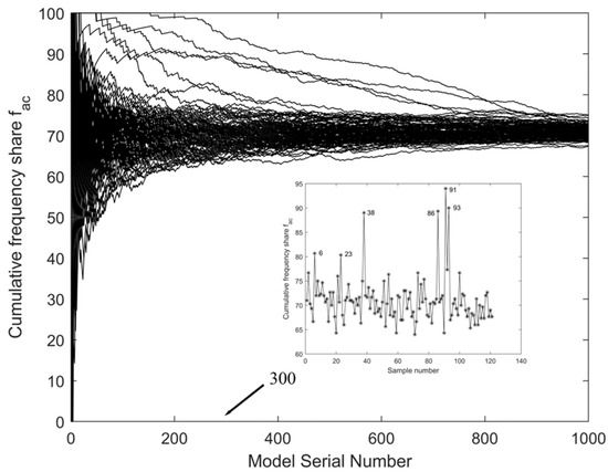 In the process of identifying abnormal samples in the soil olfactory feature space using the MCCV method, 85 (121 × 70%) samples were first randomly selected from the feature space to construct 1000 BPNN models, and the remaining 36 samples were used for prediction. Figure 6 shows the variation curve of the value of for each sample with the model number after sorting, and the inset of the figure shows the for each sample of the 121 models. It can be seen from the figure that as the number of models increases (i.e., as PRESS increases), the converges to a sampling rate of 70% for each sample in the training set, but the curves for samples 6, 23, 38, 86, 91, and 93 are somewhat different from the other curves in that their values remain greater than 80% in a larger range (model number ≥ 300) as the model serial number increases. Therefore, these six samples were identified as outliers and could be considered abnormal samples.
