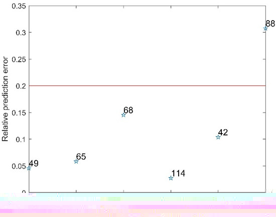 When K-means LOOCV is used to detect abnormal samples in soil olfactory feature space, it must be clustered first, as shown in Table 3, into 10 classes. According to the principle that abnormal samples are more discrete than normal samples, class 6 and class 7 have the least number of samples, and they are regarded as suspicious abnormal samples and used as prediction samples, and the relative prediction error of suspicious samples is obtained by using the LOOCV method. The results of K-means LOOCV abnormal sample detection are shown in Figure 7. The threshold of abnormal sample determination is set to 0.2 in the figure, and only sample number 88 is found to be an abnormal sample.