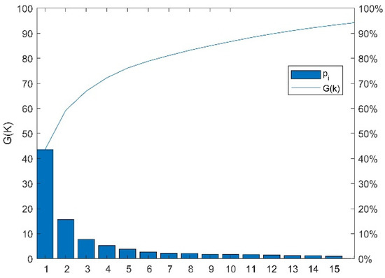 To obtain the optimization of feature space by PCA, the new soil olfactory space based on the abnormal samples removed by MCCV (115 samples × 60 features) is referred to as updated soil total nitrogen feature space (USTNFS) and optimized by PCA method with the contribution of variance information of each principal component as pi, and the cumulative contribution of variance information (G(k)) set to 95%, and the results are obtained as in Figure 8. As can be observed from the figure, the cumulative contribution rate of variance information of the first 15 principal components is 94.32%, which can basically reflect the amount of information in the original feature space, i.e., the original feature space can be reduced to 15 dimensions and reconstruct a sample set (115 samples × 15 features).