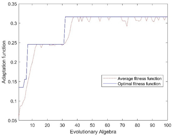 Similarly, the GA-BP method is used for USTNFS to optimize its features, and the output condition is set to 100 iterations. Figure 9 shows the evolution curve of the fitness function, from which it can be seen that the best fitness curve remains unchanged when the number of species iterations exceeds 32, indicating that it has been optimized to the best effect. At this time, the number of the filtered set of optimal feature vectors are: 1, 2, 4, 6, 7, 10, 12, 16, 18, 20, 21, 23, 24, 25, 27, 29, 30, 32, 33, 34, 36, 40, 41, 43, 45, 46, 47, 51, 52, 53, 55, 58, and the original feature space is reduced from 60 dimensions to 32 dimensions. A sample set (115 samples × 32 features) based on GA-BP optimization was reconstructed.