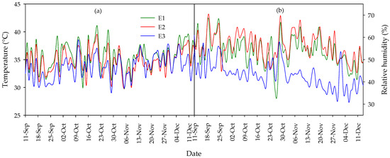 (a) Temperature (°C) and (b) relative humidity (%) in the growth chambers throughout the duration of the experiment.