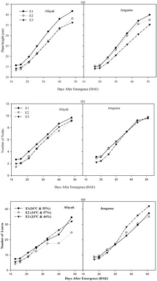With regard to plant height, both varieties (Afayak and Jenguma) produced the highest mean heights in E1 (36 °C) with Afayak showing a more rapid increase than Jenguma (Figure 2a). Similarly, environment E1 had the 10 nodes formed by 48 DAE for the Afayak variety whereas the same number of nodes appeared on 50 DAE for Jenguma (Figure 2b). Thus, the Afayak variety showed greater sensitivity to increasing air temperature with regard to node appearance. Jenguma showed little or no difference in the number of nodes formed in all three environments prior to flowering.