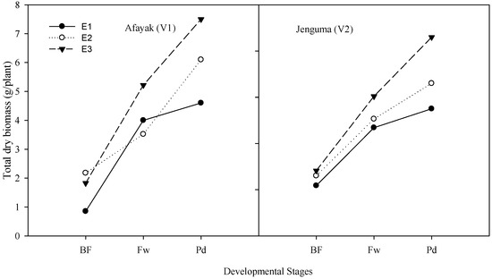 The overall growth pattern showed a general increase in biomass accumulation as development stages progressed under each temperature environment and variety (Figure 3). However, there was a decline in the growth of Afayak from flowering to the onset of podding in E2. In the case of Jenguma, the decline in growth was sharper for E1 (hottest chamber). At the podding stage, the highest total dry biomass for both varieties were observed in E3 while the lowest for Afayak was observed in E2 (Figure 3). In general, increasing temperature led to a decline in biomass accumulation for both varieties.
