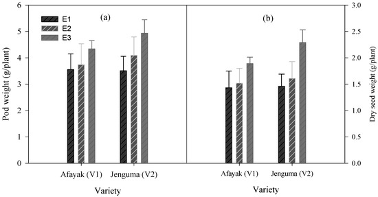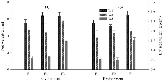 Interaction of environment and different water regimes on (a) pod weight and (b) dry seed weights (E1: 36 °C and RH—55%, E2: 34 °C and RH—57%, and E3: 33 °C and RH—44%. W1, W2, W3 are near saturation, field capacity, and drought, respectively. The vertical bars are standard errors of the means).