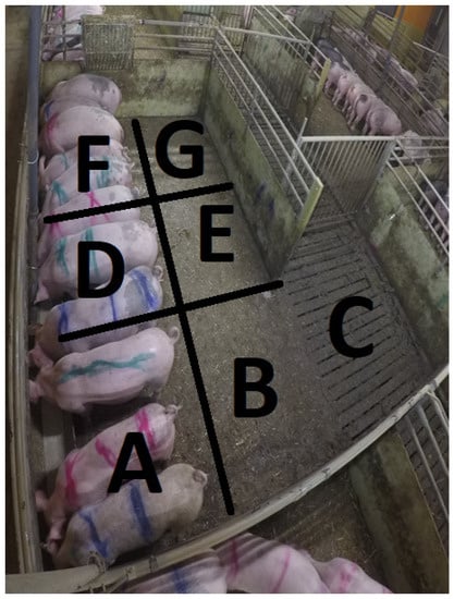 Figure 1. All pigs were individually assessed. Pigs were considered located in a zone when the larger part of the body was in that zone. If both halves of the pig were located in two zones, the pig was scored as located in the same zone as the head.