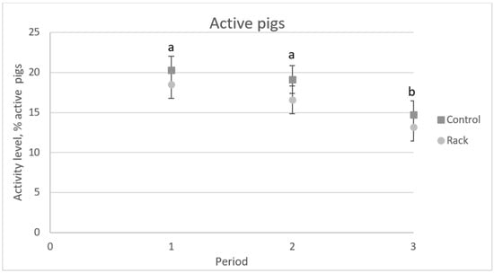17]. Our findings indicate that the older the pigs got, the less activity they displayed, and there was significantly less activity in week 11 (period 3) compared to weeks 2 and 6 (periods 1 and 2), regardless of the treatment, which is in line with previous studies [
