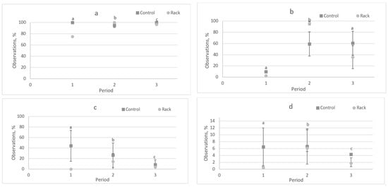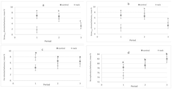 6]. This study was limited to only investigate the behaviour in a few pens that were scan sampled for exploratory behaviour at 10 min intervals. By choosing to study two adjacent pens (CONTROL and RACK) we minimised the effect of a microclimate in the pens that may have affected the treatment effect as the two adjacent pens probably had similar microclimate. The scanning of behaviour every 10 min enabled the determination of the overall behaviour patterns and activity levels. However, the scan sampling did not allow for the registration of more subtle behaviours (i.e., short in timing) such as social interactions. Use of shorter intervals (1 min intervals was possible) between the pictures would not have enabled a proper investigation of, e.g., social interactions. In order to assess such behaviours, continuous sampling would have been required, which was not possible during this study. As the exploratory behaviour was possible to assess from the pictures, along with the previous findings that an increased exploratory behaviour reduces, for example, tail-biting behaviour, it was considered a relevant option [