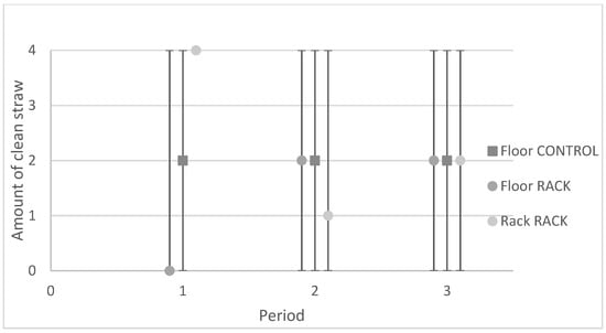 floor scores 1 (less than 0.1 L of straw) and 2 (between 0.1–1.0 L of straw) compared to CONTROL, while during period 3, there was more straw score 4 (more than 20 L of straw) in CONTROL. In RACK, there was however commonly straw left in the rack (