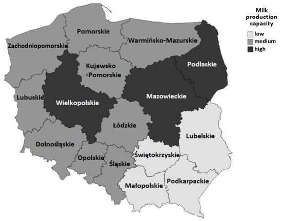 The relationship between the initial and the intermediate segments of the dairy supply chain has become the rationale for the establishment of cooperatives. Farmers’ cooperative ownership has a long tradition in many parts of the world and is the most prevalent form of vertical integration in dairy supply chains [21]. Dairy cooperatives have played an important role in the dairy processing sector in Europe [22]. Poland is a prime example, as more than 70% of its dairies operate as a cooperative compared to about 20% in most EU countries [23]. Poland is one of the leading cow’s milk producers and processors in the EU (12.2 million tons cows’ milk delivered to dairies in 2019 [24]), characterized by considerable spatial diversity in its milk production capacity [25].