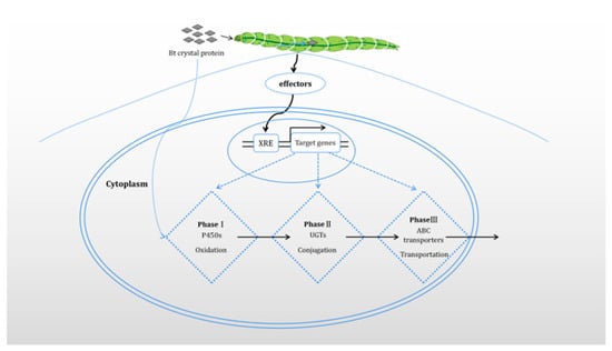 Schematic diagram of the first, second, and third stages of the insecticide metabolism system. Phase I is mainly involved in oxidation by P450s. Phase II forms a conjugate structure with the products of Phase I through UGTs. The ABC transporters in Phase III transfer the metabolites of Phase II from the cell. Insecticide ligands and effectors mediate the regulation of target genes by binding to xenobiotic response element (XRE) at different stages.