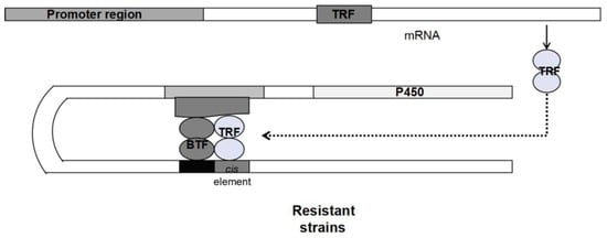 A speculative model of P450 gene regulating insecticide resistance in resistant strains. The interaction of P450 gene in resistant strains with basic transcription factor (BTF) and cis-acting element(cis- element) or trans-regulatory factor (TRF) in insecticide resistance [97].
