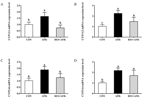 The mRNA expression levels of the CYP enzymes CYP1A1, CYP1A2, CYP2A6, and CYP3A4 were increased in the AFB1 group compared with those of the CON group (p < 0.05). However, in the group of RES+ AFB1, the mRNA levels of the CYP1A1, CYP1A2 and CYP2A6 genes (p < 0.05) were inhibited compared with those in the AFB1 group. Compared with the CON group, there was no significant change in the mRNA expression levels of CYP1A2 and CYP2A6. (Figure 1).