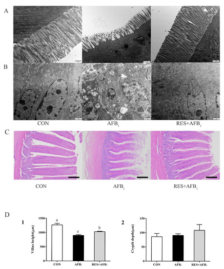 Representative photomicrographs and ultrastructural pathological changes in ileum villi are shown in Figure 1. Compared with the CON group, histomorphological changes were observed in the ileum of the AFB1-fed ducks, which included epithelial denudation (black arrow) and a corresponding decrease in villus height (p < 0.05). Microscopically, compared with the ileum of the AFB1-fed ducks, 500 mg/kg RES supplementation in the diet increased villus height in the ileum, which was not different from that of the CON ducks unchallenged with AFB1. As indicated by the white arrows, dietary RES alleviated epithelial denudation and repaired the structure of ileum villus compared with the AFB1 group. However, there was no significant difference in crypt depth among the CON group, the AFB1 group and the RES + AFB1 group. In comparison with the CON group, the AFB1 group exhibited ultrastructural changes in intestinal microvilli and mitochondria, such as disappearance of mitochondrial cristae (black arrows pointed), and reduction in the microvillus height associated with larger gaps. In contrast, RES supplementation in diet restored fractured and swollen mitochondria with broken and cracked cristae induced by AFB1. Meanwhile, RES supplementation in diet could restore the AFB1-induced pathological changes in microvilli. (Figure 2).
