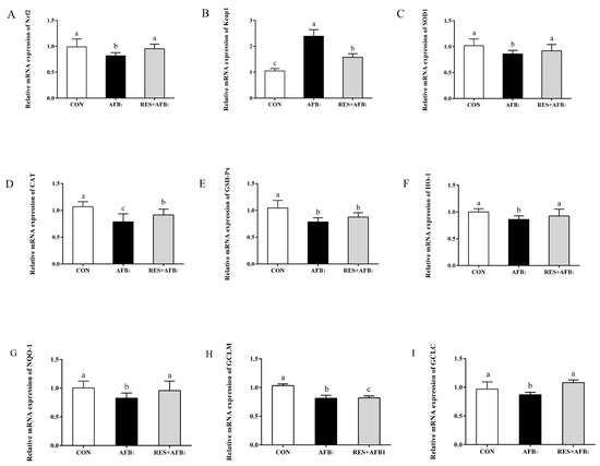 (A–I) Effect of RES on the mRNA expression levels of antioxidant genes in the ileum of AFB1-exposed duck. Values are expressed as mean ± SD, n = 8. Labeled (a, b, c, a > b > c) means in a row without a common letter differ, p < 0.05. Nrf2: Nuclear Factor E2-related Factor 2; Keap1: Kelch-like ECH-associated protein 1; SOD1: Superoxide dismutase 1; HO-1: Heme oxygenase-1; NQO-1: NADPH quinineoxidoreductase-1; GCLM: Glutamate-cysteine ligase modifier subunit; GCLC: Glutamate-cysteine ligase modifier subunit.
