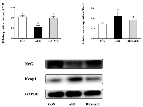 Effect of RES on protein expression of Nrf2 and Keap1 in the ileum of AFB1-exposed duck. Values are expressed as mean ± SD, n = 8. Labeled (a, b, c, a > b > c) means in a row without a common letter differ, p < 0.05. Nrf2: Nuclear Factor E2-related Factor 2; Keap1: Kelch-like ECH-associated protein 1; GAPDH: Glyceraldehyde-3-phosphate dehydrogenase; CON: Control group; AFB1: AFB1 group; RES+ AFB1: RES+ AFB1 group.