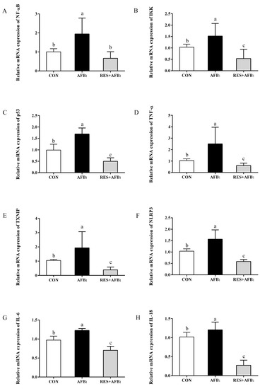 (A–H) Effect of RES on the mRNA expression levels of antioxidant genes in the ileum of AFB1-exposed duck. Values are expressed as mean ± SD, n = 8. Labeled (a, b, c, a > b > c) means in a row without a common letter differ, p < 0.05. IKK: Inhibitor of nuclear factor kappa-B kinase; p53: p53 tumor suppressor protein; TNF-α: Tumor necrosis factor-α; IL-6: Interleukin-6; IL-18: Interleukin-18.