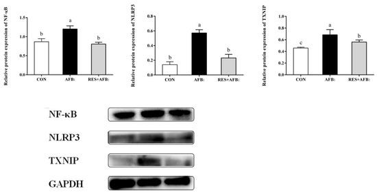 Effect of RES on protein expression of NF-κB, NLPR3 and TXNIP in the ileum of AFB1-exposed duck. Values are expressed as mean ± SD, n = 8. Labeled (a, b, c, a > b > c) means in a row without a common letter differ, p < 0.05. NF-κB: Nuclear factor kappa B; NLRP3: Nod-like receptor families pyrin domain containing 3; TXNIP: Thioredoxin interacting protein.