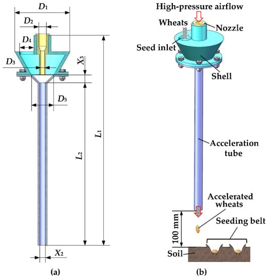 The pneumatic wheat-shooting principle is shown in Figure 1b. Before sowing, the ground distance from the bottom of the acceleration tube to the soil surface is 100 mm. After the high-pressure airflow enters the pneumatic wheat-shooting device, a supersonic jet-flow field is formed in its internal cavity. Firstly, the high-pressure airflow enters the nozzle and is compressed to form a compressed airflow. The compressed airflow is ejected from the nozzle to form a jet flow after that. Then the jet flow enters the acceleration tube to develop a positive-pressure acceleration zone. Meanwhile, a vacuum-pressure zone is produced in the shell. Wheat is inhaled into the shell under the entrainment of the vacuum-pressure zone [,], and then it is continuously accelerated under the action of the positive-pressure acceleration zone in the acceleration tube. Finally, the wheat with high kinetic energy is shot out from the acceleration tube and is lodged into the soil to complete wheat seeding. With the forward thrust of the seeder, a sowing belt composed of single wheat-seed holes is formed in the soil. Table 1 displays the geometric information of the PWSD.