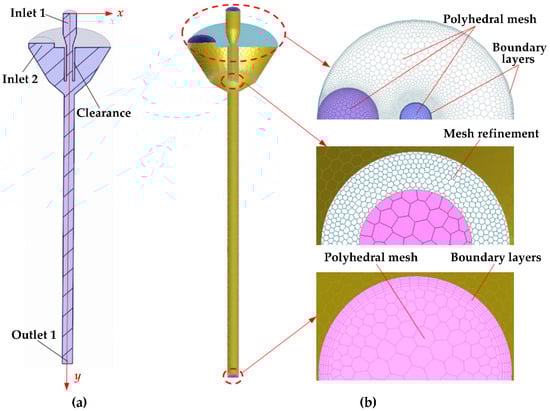 The grid features and extraction of the computational domain are crucial and determine the results of the flow-field analysis [,]. SolidWorks 2016 software was adopted to construct the various three-dimensional PWSD models. Then the internal cavity was extracted as the computational domain using SpaceClaim 18.2 software, as shown in Figure 2a. The pressure inlet boundary was given on inlet 1 based on the working pressure of the experiment design scheme, and on inlet 2 with the relative pressure value of 0 kPa. The pressure outlet boundary was given on outlet 1 with the relative pressure value of 0 kPa. All the walls were no-slip wall boundaries. CFD cells of computational domain meshed by Fluent 18.2 software were employed as shown in Figure 2b. According to the structure size of the computational domain in globally scoped sizing, the minimum element size and the maximum element size of the mesh models were 0.2 mm and 30 mm, respectively. The growth rate was 1.2, and the grid type was polyhedral mesh. In addition, curvature function was selected for object faces, and edges and the normal angle was set at 15°; cells per gap was set at 10 in proximity for the edge zone to increase local mesh density, which is because the gas expansion at the nozzle outlet leads to drastic changes in the airflow velocity [,]. According to the wall function requirement of the turbulence model, five boundary layers were set near the wall. Statistical data pointed out that the maximum aspect ratio, the y+, and the minimum orthogonal quality of all simulation models were controlled in the range of 19–27, 30–280, and 0.5–0.62, respectively.