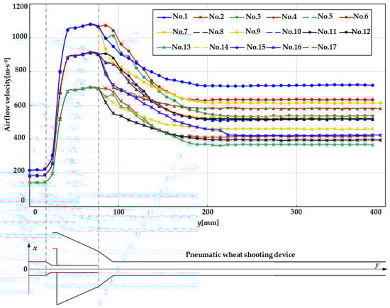 - The central airflow velocity of the pneumatic wheat-shooting device showed a sharp increase to a maximum value, then presented a gradual decrease trend, and finally remained relatively constant by simulation analysis. The steady airflow velocity was between the maximum airflow velocity and the high-pressure airflow velocity for each experiment. The higher the high-pressure airflow velocity, the greater was the maximum airflow velocity;