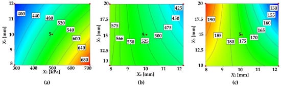 The interaction of X2 and X3 on Y2 with X1 = 500 kPa is shown in Figure 4c. Y2 decreased with the increase of X2 under the same X3 level. In addition, there was a negative correlation between X3 and Y2 as X2 was 8–9.5 mm and a positive correlation with X2 was 9.5–12 mm. Hence, an optimal parameter combination of X1, X2 and X3 maximized Y2.