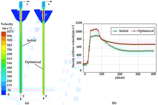 The velocity airflow field was evaluated for the PWSD with the initial combination of parameters (X1 = 500 kPa, X2 = 10 mm, X3 = 10 mm) and the optimized combination of parameters (X1 = 686 kPa, X2 = 8 mm, X3 = 20 mm), as shown in Figure 5. The optimized device displayed superior performance of faster and more stable airflow field in relation to the initial device in general. The initial device obtained parameters of Y1 and Y2 of 524 m·s−1 and 176 mm, respectively, whereas the optimized device performance was 718 m·s−1 and 188 mm, respectively (Figure 5). After improvement of the PWSD, Y1 significantly increased by 34.5% while Y2 increased by 9.1%. Furthermore, a comparative analysis between the optimized simulation results and the predicted results of the 2FI regression model shows that there is little difference because the errors of Y1 and Y2 are 1.8% and 2.1% for the initial and optimized device, indicating that a good accuracy of the model for parameter optimization.
