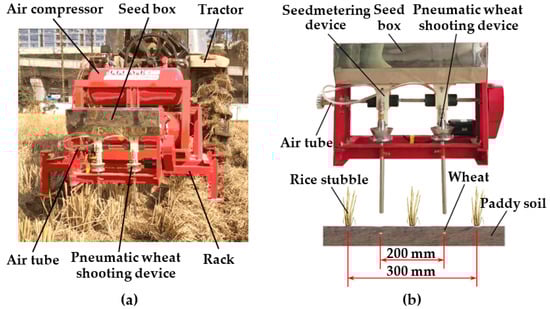 As one of the three major grain crops in China, wheat plays a vital role in ensuring national food security. According to the National Bureau of Statistics data, wheat yield in China will be 131.68 million tons in 2020 [], accounting for about 17% of the world wheat production. Rice–wheat rotation areas located in the Yangtze River Basin are reported as the primary grain-production bases in China, accounting for more than 37% of total wheat-planting areas []. Due to the sticky clay soil texture and serious wet damage of the fields in this area, there is a severe blockage, low working efficiency and poor seeding quality for the existing rice-stubble wheat seeders [,,,]. Therefore, it is essential to innovate mechanized sowing technology and improve wheat-sowing quality in rice–wheat rotation areas.
