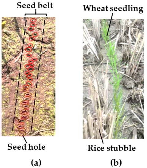 The PWSD conducts seeding on the no-till soil between the rows of rice stubble, as shown in Figure 6b. The rice-stubble height was 200–350 mm; the coverage of rice straw was about 608 g·m−2; Zhengmai 9023, which is a large-scale planted variety of wheat in Hubei Province, was used for this test. Perennial rice–wheat rotation is conducted in this test plot, and the soil type is clayey paddy soil with heavy texture and high moisture content. The soil moisture content was 40.3%, and the soil compactness was 35–70 kPa within the soil depth of 0–50 mm.