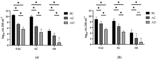 The means of culturable bacteria of swab samples (log10 cfu 250 mL−1) for the total aerobic counts (TAC), Enterococcus spp. (EC), and Enterobacteriaceae spp. (EB). Quantitative determination was performed at the end of the production cycles before water cleaning (BC), after water cleaning (AC), and after disinfection (AD) of poultry barns. (a) The data for the broiler barns; (b) The data for the turkey barns. For each parameter, the counts that were significantly different between the sampling times are labeled with * (p < 0.05). The differences without statistical significance are labeled with ns.