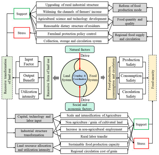 The RLUT system has three parts: factor input, output benefit, and utilization intensity. The FS system has three links: production, consumption, and circulation. This promotes the coupling and coordination of the two systems through mutual influence of capital, technology, labor force, industry, ecological environment, and other factors [45] in the following two ways: