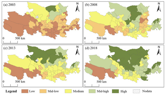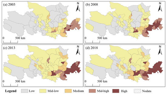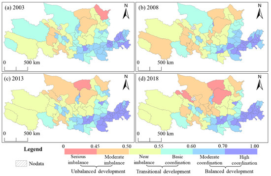 Figure 5. Level of coupling coordination between RLUT and FS in the YRB. (ad) denote the coupling coordination level between RLUT and FS in 2003, 2008, 2013 and 2018, respectively.