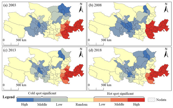 The local Moran’s I index can reflect the correlation degree of the CCD of each city unit, and the hot-spot evolution map reflected the spatial agglomeration characteristics of the CCD during the study period (Figure 6). The main results were as follows:
