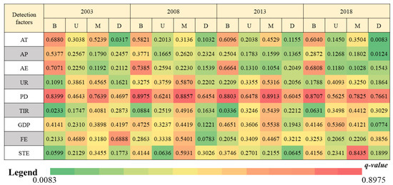 According to the previous analysis, there were obvious spatial agglomeration characteristics in the CCD between RLUT and FS in the YRB. Hence, the geographical detector model was used to explore the influence of natural, social, and economic factors on the CCD. By using the natural breakpoint method, the dominant factors were divided into eight categories, and the q values of different influence factors on the CCD of the two systems were obtained (Figure 7). There were significant differences among various influencing factors. According to the q value, the influence factors were divided into main factors (>0.5), secondary factors (0.2–0.5), and general factors (<0.2). The year-wise influence on the degree and the changing trend of factors are shown in Table 5.