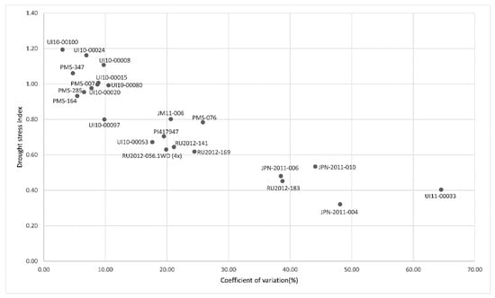 Scatter plot of coefficient of variation and drought stress index of the Soil Plant Analysis Development (SPAD) Chlorophyll meter value in screening experiment at Hokkaido University, Sapporo, Japan of drought-stress tolerance. Scatter points encircled by solid circles represent resistant genotypes. Scatter points encircled by dotted circles represent susceptible genotypes.