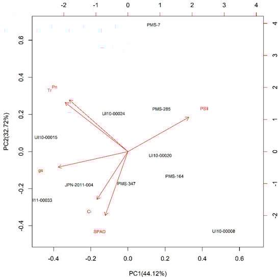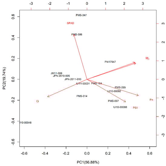 Principal component analysis (PCA) bi-plot of drought stress index (DSI) of six physiological traits (photosynthetic rate (Pn), stomatal conductance (gs), transpiration rate (Tr), intercellular CO2 concentration (Ci), the Soil Plant Analysis Development (SPAD) Chlorophyll meter value, and chlorophyll fluorescence (PSII)) under drought over a 14-day period in screening experiment at Brigham Young University, Provo, UT, USA. Arrows represent physiological traits with various lengths, which were based on the impact of each trait on the separation of genotypes.