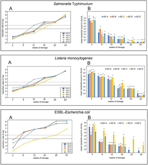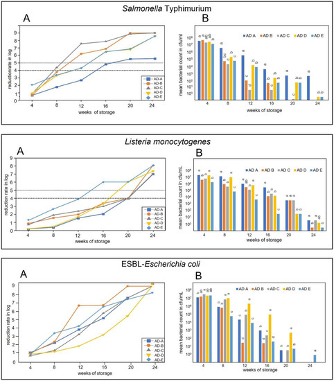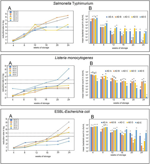 Storage under temperature profile 2 conditions also revealed several significant differences between the different pathogens and between different Ads (Figure 2). Salmonella Typhimurium reduction was higher than for L. monocytogenes and E. coli-ESBL until week 16. In detail, the content of S. Typhimurium reached the 4-log reduction threshold after 12 weeks (AD-B, AD-C, AD-D, and AD-E) or after 16 weeks (AD-A). The 5-log reduction value was reached in AD-B and AD-C also after 12 weeks, in AD-D and AD-E after 16 weeks, and only in AD-A after 20 weeks of storage. For ESBL-E. coli, the predetermined 4-log reduction value was reached after 12 weeks for two inoculated ADs (AD-B, AD-E), after 16 weeks for AD-A and AD-C, and only after 20 weeks for AD-D. The threshold of 5-log reduction was met after 12 weeks for AD-B, after 16 weeks for AD-A, AD-C, and AD-E, or after 20 weeks of storage for AD-D. Anaerobic digestates inoculated with L. monocytogenes reached both the 4-log and the 5-log reduction threshold after 16 weeks (AD-E) or after 20 weeks (AD-D) or after 24 weeks of storage (AD-A, AD-B, AD-C), respectively. Significant differences in L. monocytogenes reduction rates between the different inoculated ADs were found throughout the experiments (p ≤ 0.05; Figure 2).