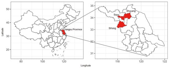 The sample collection area was located in the northern part of Jiangsu Province. The red area represents three farm types: Suyu henneries, Shuyang gooseries, and Sihong dairy farms.
