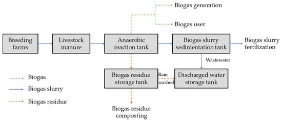 The sample collection area was located in the northern part of Jiangsu Province (33°12′17″~34°24′38″ N, 117°6′19″~119°12′50″ E), in a warm temperate monsoon climate zone. The average temperature is 14.2 °C, and the average annual precipitation is 910 mm. Six farms for each type of the Suyu henneries, Shuyang gooseries, and Sihong dairy farms, with a production volume of more than 500 heads, were sampled for detection and evaluation (Figure 1). The front-end manure treatment mode of the selected farms is an above-ground biogas project, which is composed of an above-ground fermentation tank, a biogas residue storage, a biogas slurry sedimentation tank, and a discharged water storage tank (Figure 2). Based on the principle of random sampling, 18 samples for each farm were collected from the biogas residue storage, the biogas slurry sedimentation tank, and the discharged water storage tank, respectively, including 6 replicates of biogas residue, biogas slurry, and sewage samples.