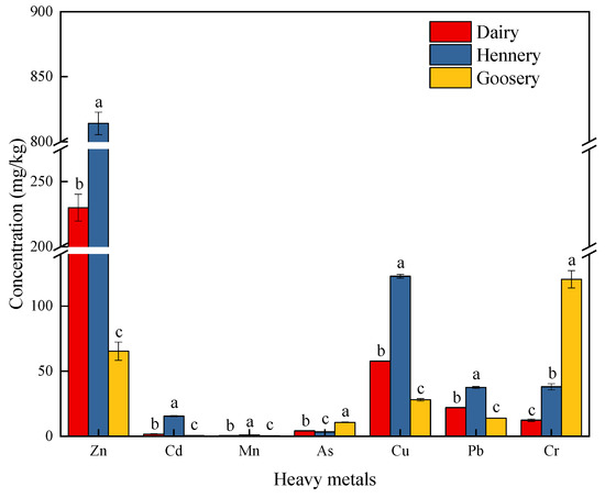 Concentrations of heavy metals in biogas residues from three types of farms. Different letters indicate significant differences between different types of farms (p < 0.05).