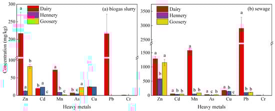 Concentrations of heavy metals in biogas slurry (a) and sewage (b) from three types of farms. Different letters indicate significant differences between different types of farms (p < 0.05).