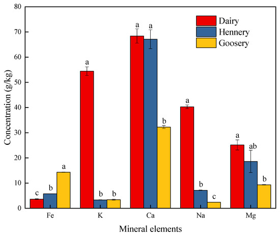 Concentrations of mineral elements in biogas residues from three types of farms. Different letters indicate significant differences between different types of farms (p < 0.05).