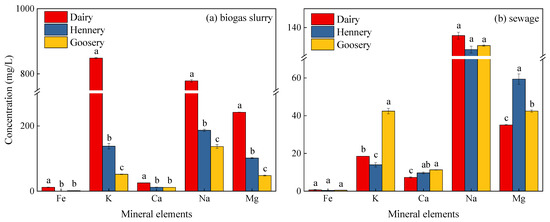 Concentrations of mineral elements in biogas slurry (a) and sewage (b) from three types of farms. Different letters indicate significant differences between different types of farms (p < 0.05).